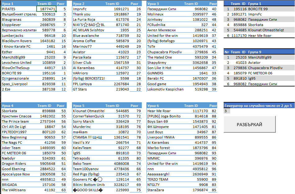 Тегли се автоматичен случаен жребий за 16 групи от по 6 отбора. Всяка група има по един отбор от всяка от 6те урни за жребия.